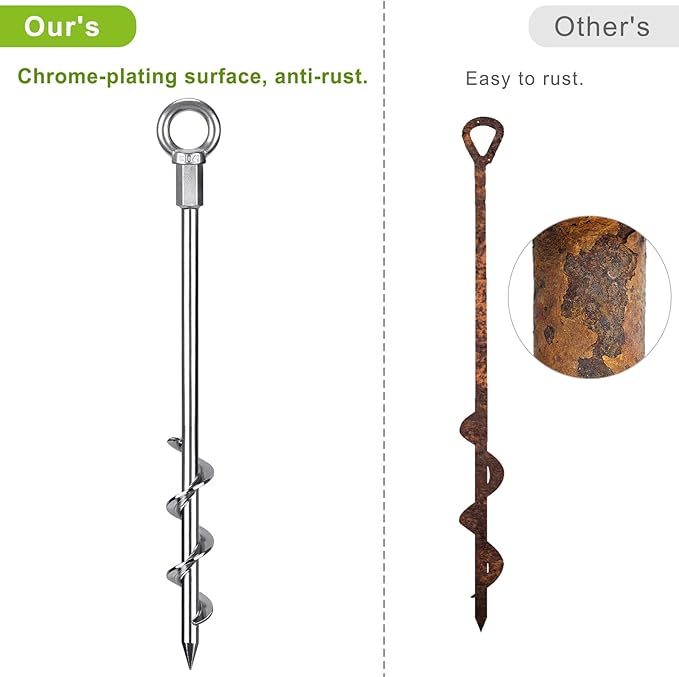 - 【Stable & Reliable】The 5-inch fully welded spiral anchors easily penetrate hard or rocky soil, providing a firm hold for your tents, trampolines, and other outdoor setups, even in high winds