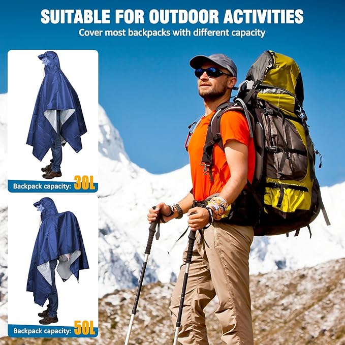 - Breathable and Comfortable: Don't worry that it will make you very hot because the arm holes & bottom are loose enough to allow air circulation.The display size of this poncho is 86" X 55". The size is large enough to cover up a backpack as well. It offers excellent freedom of movement, which makes it very comfortable to wear. You can adjust the hood and the side fasteners to suit your needs.