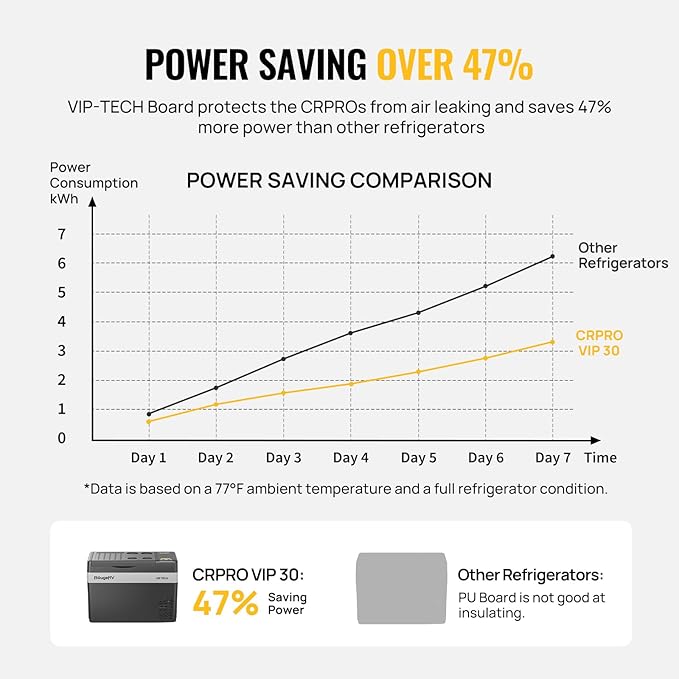 - Less power consumption: With the CRPRO VIP technology, the 12-volt refrigerator can keep your meat fresh for around 37 hours after you cut off the car power when the meat is at -4°F. Compared with other refrigerators, this refrigerator only consumes around 168kWh/Year. This upgraded refrigerator also adds an interior LED light for you to use at night
