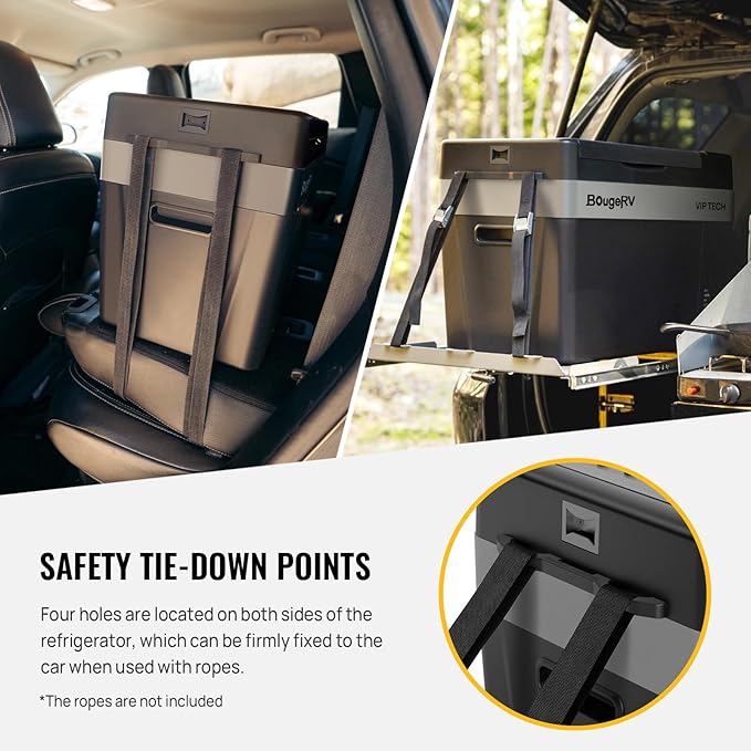 - 4 Safety Tie-down Points: Through four holes located on both sides of the CRPRO refrigerator, it can be fastened securely with ropes in your car truck, seat, and other slippery surfaces. Do not worry about the refrigerator moving when driving the car