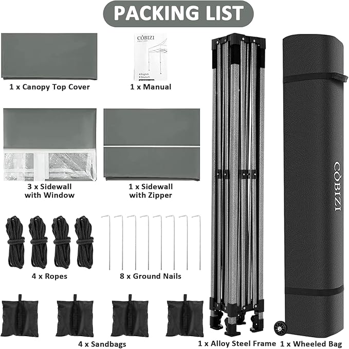 COBIZI 10x10 Pop Up Canopy with 4 Sidewall,Heavy Duty Canopy UPF 50+ All Season Wind Waterproof Commercial Outdoor Wedding Party Tents for Parties Canopy Gazebo with Roller Bag(10 x 10 ft Gray)