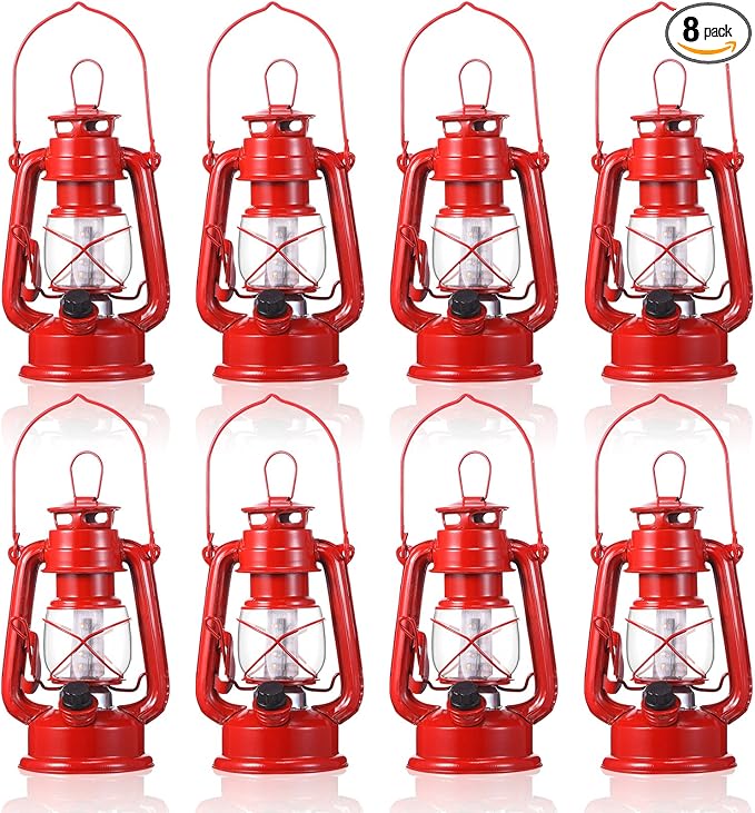 Hortsun 8 Pcs 8 Inch Vintage LED Hurricane Lantern Metal Red Outdoor Battery Operated Hanging Lantern with Warm LEDs and Dimmer Switch for Indoor Rustic Farmhouse Country Camping Decor