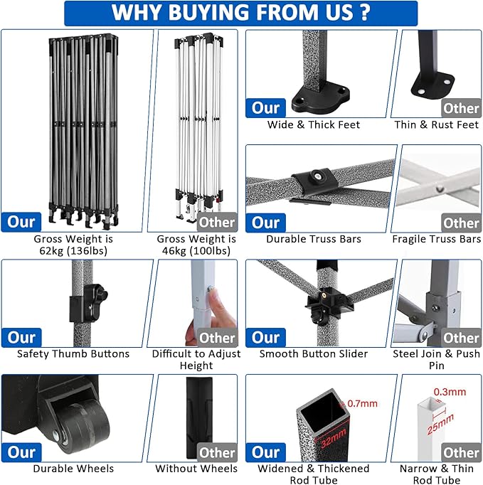 - 【Heavy Duty Alloy Steel Frame】The upgraded 10x30 commercial pop up canopy tent frame can hold up to 220 lbs (100 kg) on a single pole. The frame can hang 11 adults at the same time! Can withstand 4 winds.(<18 mph). 10x30 party tent with an upgraded alloy steel full truss structure, and reinforced plastic parts at the stress points at the intersection of the peaks and poles. 10x30 heavy duty canopy frame with powder coated coating guarantees rust resistance and corrosion resistance.