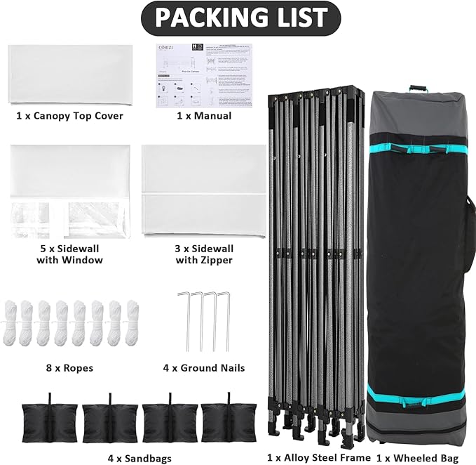- 【Wheeled Storage Bag】10x30 canopy wheeled roller bag size is 164x66x24cm (64.6x26.0x9.4inch), 600D Oxford Cloth fabric. Storage bag with 4 wheels on the bottom for easy transport. 3 handle on the side for 2 people to lift. 1 handle on the top for 1 people to glide. The Package Includes: Pop up Canopy Frame x 1Pcs + 10′x30′ Canopy Tent Top Cover x 1Pcs + Sidewall with Zipper x 3Pcs + Sidewall with Window x 5Pcs + Sandbag x 4Pcs + Ground Nails x 4Pcs + Ropes x 8Pcs + Wheeled Storage Bag x 1Pcs.