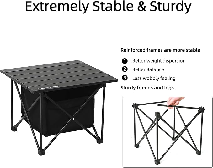 - STURDY & DURABLE: This camping table is built with an aerospace-grade aluminum alloy, waterproof, no rust, corrosion resistant, easy clean, rugged enough for all your outdoor needs. Sturdy structure, with a strong joint and connector, Its unique hinge design enables easy and robust connection to the table top. Unique anti-slip leg caps design, super stable and safe to use