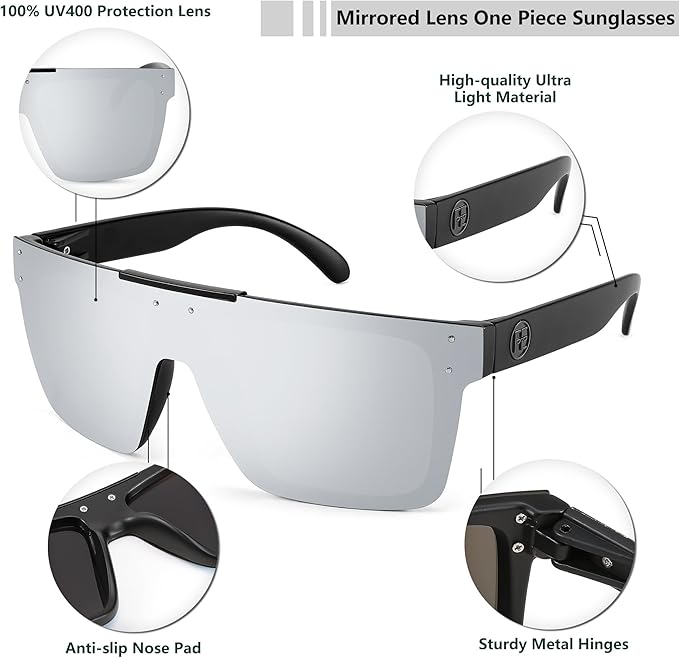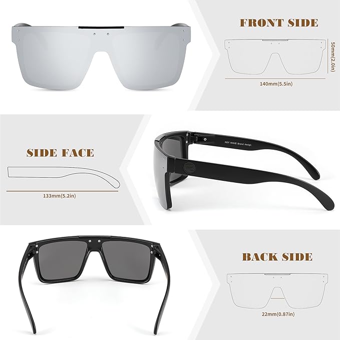 - 【Flat Top Shield Sunglasses】These Retro Sunglasses with an oversized square frame design, oversized sunglasses for men, can well modify the face shape, the overall appearance of the sunglasses is very fashionable, trendy, cool, unique, and cute, and also suitable for high fashion accessories and daily wear all year round