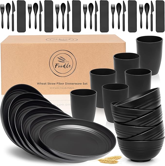 FOODLE Wheat Straw Dinnerware Set - BPA Free - Unbreakable, Microwave & Dishwasher Safe- Alternative to Plastic Dishes - Perfect for Outdoor, RV, Dorm - Camping Plates Cups and Bowls Set - For 6