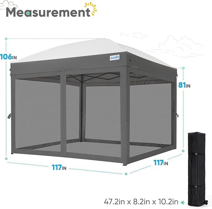 - [MESH SCREEN NETTING]: The pop up canopy tent with netting to keep unwanted elements away and let fresh air & light in. The net connects to top with 360 degree velcro strap,fully enclosed. This pop up canopy is a perfect screen house for backyard,deck,camping or other outdoor activities.
