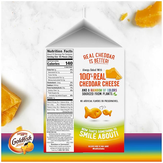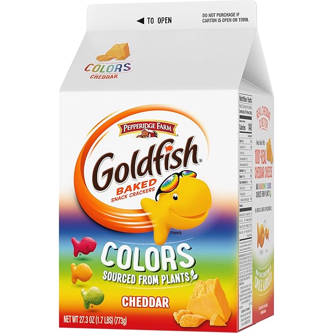 - The colorful snack that smiles back: Goldfish colors cheddar cheese crackers are colorful fish-shaped snack crackers with a smile