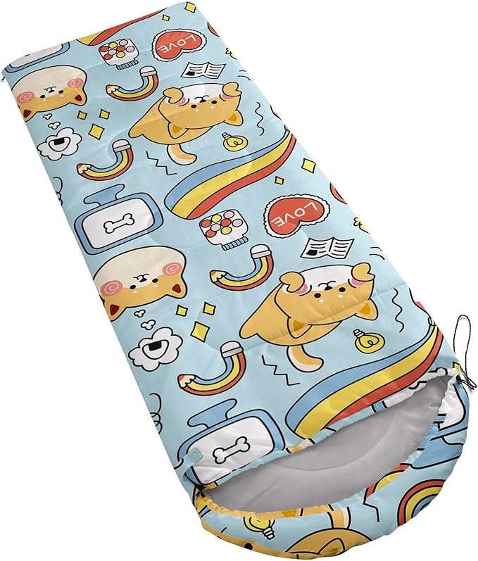 - SUITABLE:The sleeping bag can be used for 3 Seasons.SIZE:80*230cm Suggenal extreme temperature: 41 ℉ -77 ℉.Applicable in a variety of scenarios,such as Travel camping pajamas party,It's very suitable for you to travel with your children.Half-circle hood with adjustable drawstring,which can keep you warm and prevent your humidity
