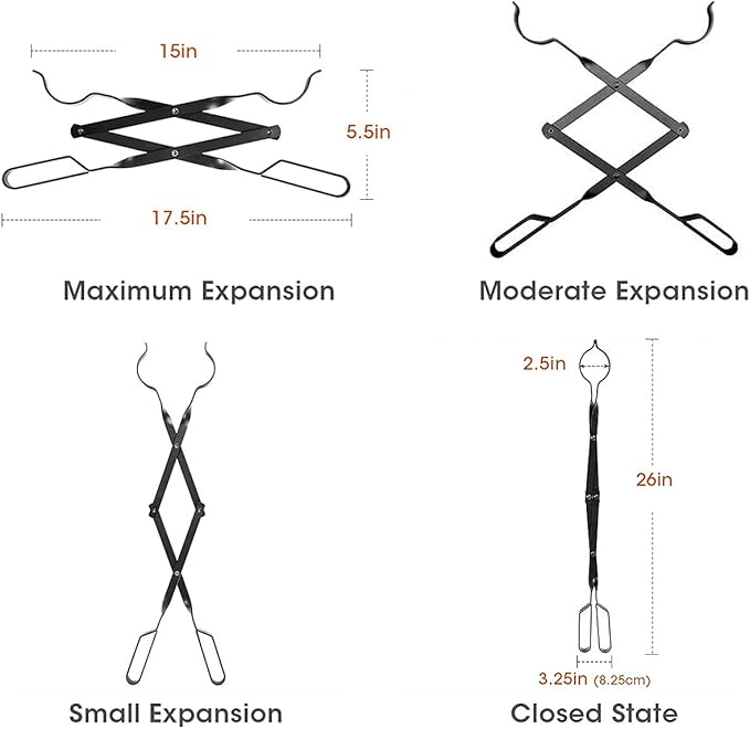 - Dimensions: The fireplace tongs measure 26-Inch long. For closed state, it's 26 x 3.25 x 2.5 inches and for maximum expansion measures 15 x 17.5 x 5.5 inches. Fireplace tongs log grabber can hold up to 12" thick logs, including the heaviest woods.