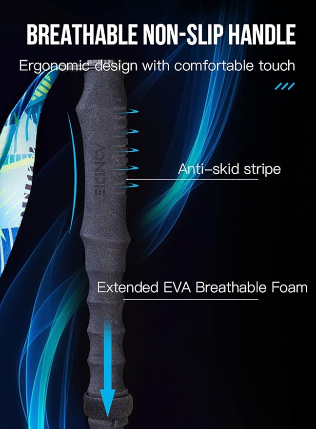- 【Comfortable Non-slip Grip】Hiking sticks feature a comfortable EVA grip that provides a firm handgrip and makes the poles easier to hold without slipping even when your hand is wet. The poles also contain a comfortable moisture-wicking wrist carrying strap, so you never lose your poles. Built for those who conquer terrain no matter the weather conditions.