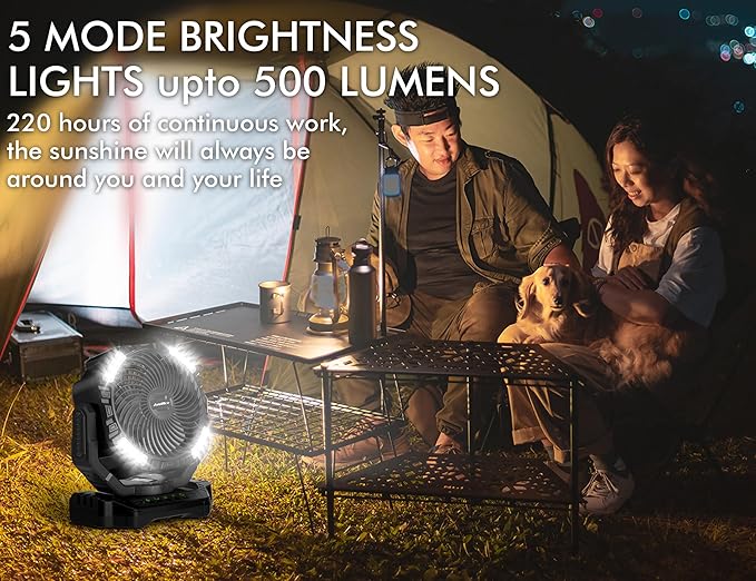 - 4 High Velocity Speed and 5 Brightness Lights: Equipped with 9 inch Blade and 32 LED beads of this camping fan, make it with high brightness and powerful wind speed (25-50dB), and it can be use for variety of scenarios, illuminates your surroundings and keep you cooling in dark and hot places, great for garage job-site camping tent, bedroom, home, office, RV. The highest speed can reach up-to 4.9m/s, you can still feel the airflow even up to 30ft away