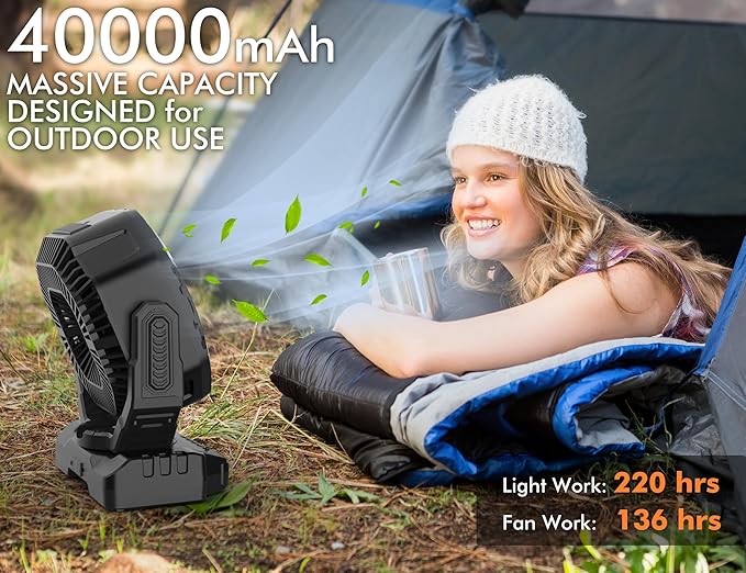 - 40000mAh Mighty Battery: This Portable fan built in 40000mAh rechargeable battery, it can be work 15-220 hrs when fully charged (9-10hrs), the battery indicator help you keep track of remaining power. Equipped with 5V/3A type-C input/output port and a USB-A output port (on the back of the fan base), can be power for other electronic devices. It's a lifesaver in emergencies like Hurricanes, Storms, heatwaves, power outages, and also perfect for camping, outside, travel, work, construction etc