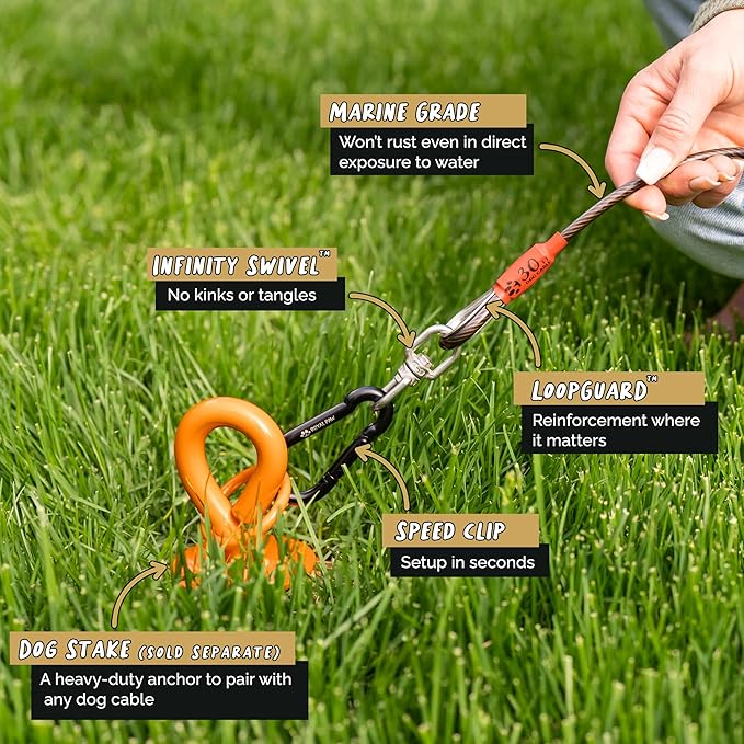 - PATENT PENDING & DESIGNED IN THE USA! Our Tie Out Cable for Dogs are built to last. Extended warranty is available upon registration. Have issues? Our experts are on standby and will reply in 12 hours or less.