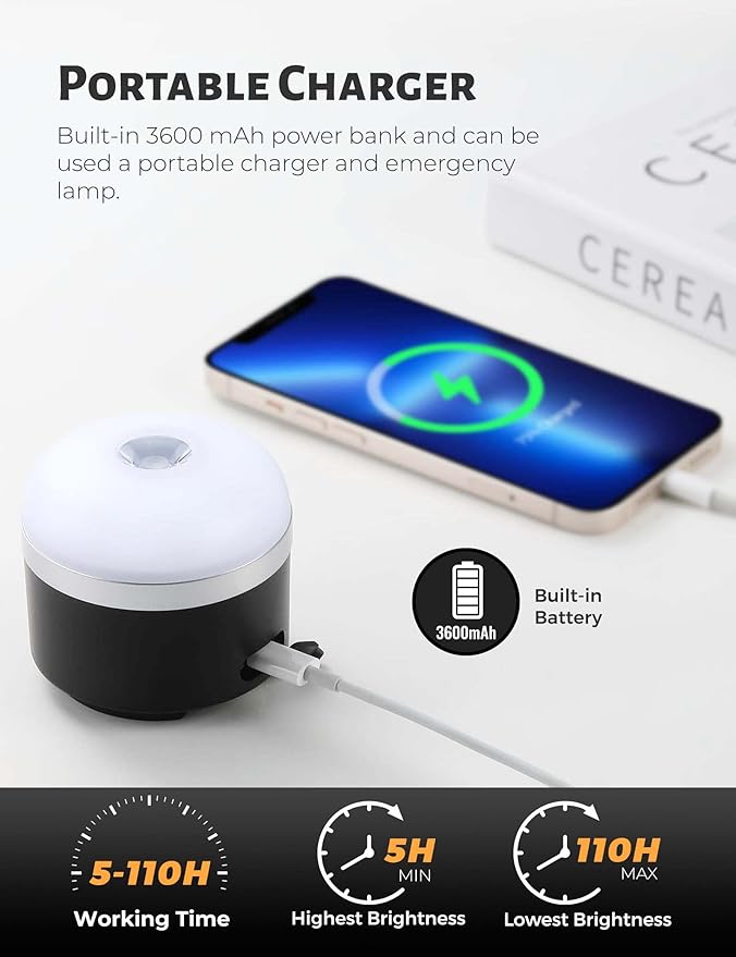 - Portable Charger: Built-in 3600 mAh power bank makes it a portable charger for your phone and emergency lamp. Included USB cord can be used to charge, no need constantly to change batteries.