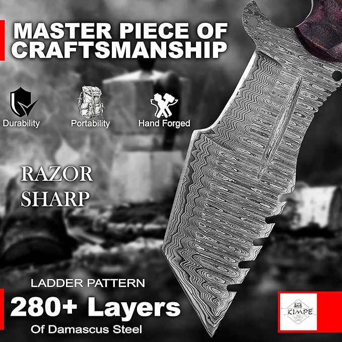 - MATERIALS: - Composed of 1095 and 15N20 High Carbon steel, folded 5 times, starting from 9-layers into a ladder pattern of 288+ layers of Damascus steel. Shatter proof to withstand any hunting task.