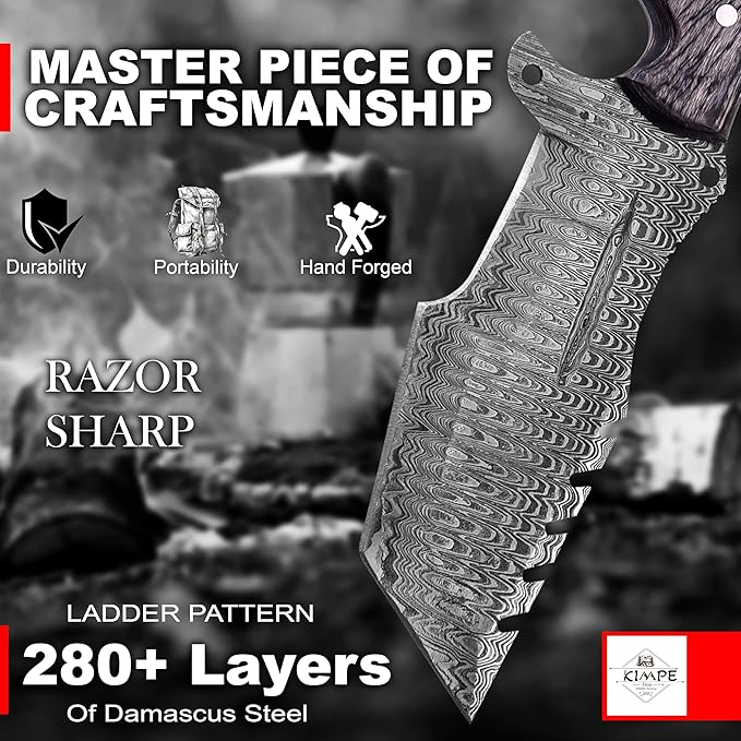 - MATERIALS: - Composed of 1095 and 15N20 High Carbon steel, folded 5 times, starting from 9-layers into a ladder pattern of 288+ layers of Damascus steel. Shatter proof to withstand any hunting task.