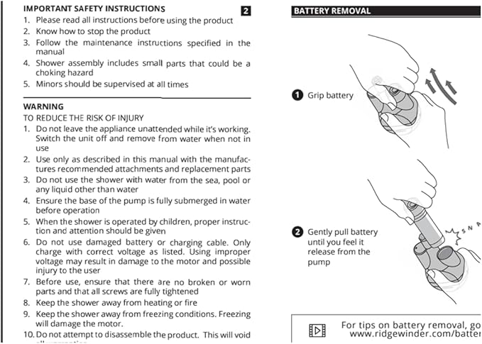 - RECHARGEABLE POWER: Up to 60 minutes of run time on the rechargeable 2200mAH battery ensures there is enough power for the entire family to enjoy their camping trip. Unlike other portable showers with clumsy cables, the battery for our portable outdoor shower simply slides into the pump and is easily removable for when it is time to charge it on any 5V USB power output.