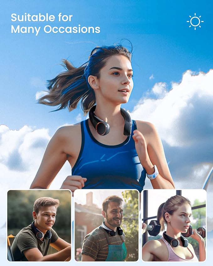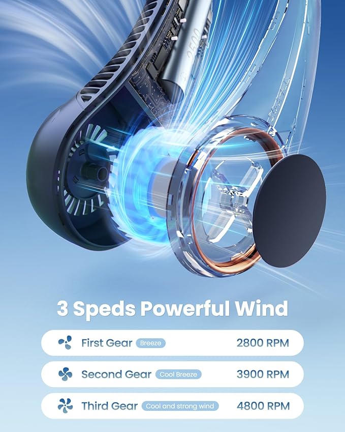 - Powerful Wind with 3 Speed Settings: This neck cooler uses turbine blades to boost airflow, delivering steady, strong wind that quickly refreshes you. You can easily adjust the speed to suit your needs—whether you want a gentle breeze or a powerful blast