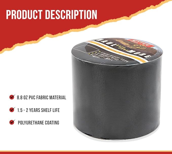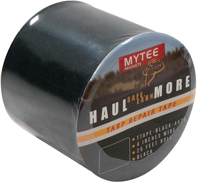 Mytee Products 8.8 oz Waterproof Black Vinyl Tarp Repair Tape 4 Inch x 25 FT with Heavy Duty Adhesive Backing - Tarp Repair Kit