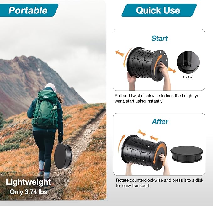 - 【QUICK & PORTABLE】 Experience instant convenience with our portable toilet! A simple pull and clockwise twist are all it takes to start using! And when you're done, just rotate counterclockwise and fold it up effortlessly. Lightweight at a mere 3.74 lbs, this remarkable toilet also boasts a convenient handle, allowing you to carry and move it around with ease.