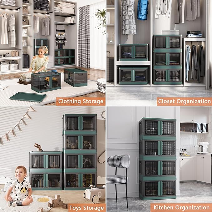 19Gal Collapsible Storage Bins with Lids & Wheels - 2 Pack Stackable with Doors, Heavy-Duty Plastic Containers for Home/Office, Green