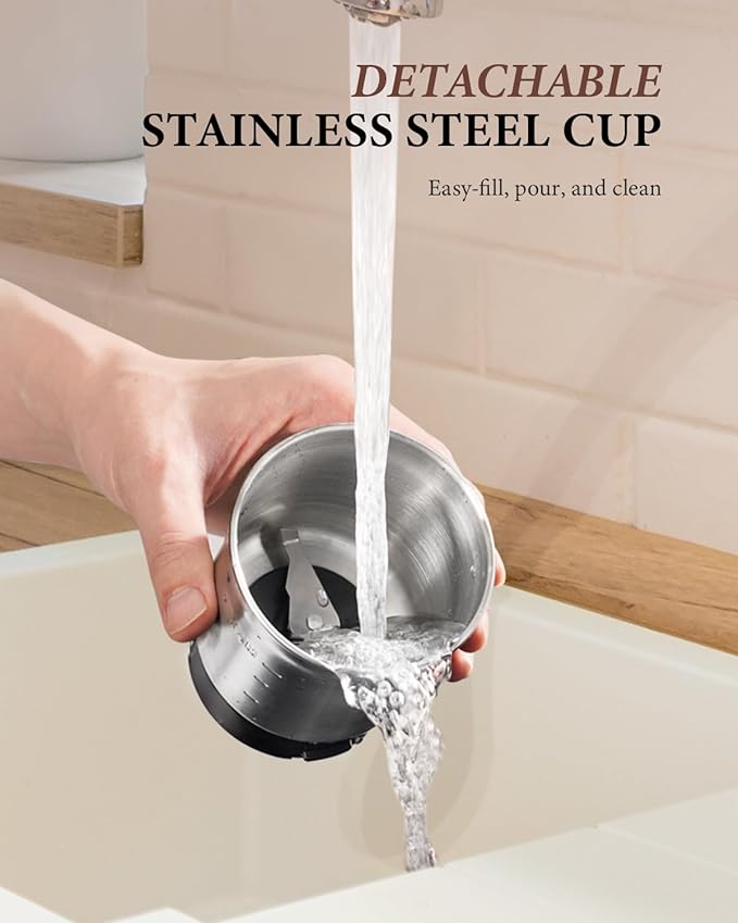- ★【Detachable Stainless Steel Cup】This dishwasher-safe, 2.5 oz. removable stainless steel cup grinds coffee beans for up to 12 cups of coffee, and is easily fillable and pourable.
