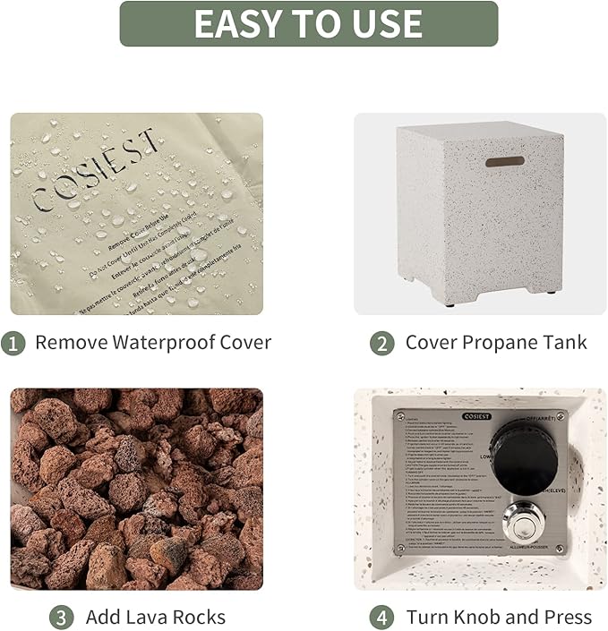 - ๐ฅใ Perfect Hideaway ใ: We use clean-burning propane fire pits but still want to keep the unsightly take tucked away out of view. That's why COSIEST makes this beautiful and ingeniously simple tank cover. Not only is it beautiful and durable, made from the same fire-retardant magnesium oxide and steel as our fire pits and tables, But It's also functional as a convenient side table that goes well with modern outdoor furniture decor with its simple clean lines.