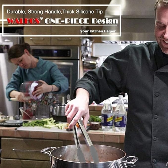 - ✓LOCKING MECHANISM & PULL-RING TECHNOLOGY -WALFOS ring-pull technology will keep your tongs from opening and closing accidentally which will allow you to facilitate better control while using them. And can be conveniently dried and stored. The set of 3 sizes Cooking Tongs- Small 7 inch, Medium 9", Large 12" is perfect for all your needs.
