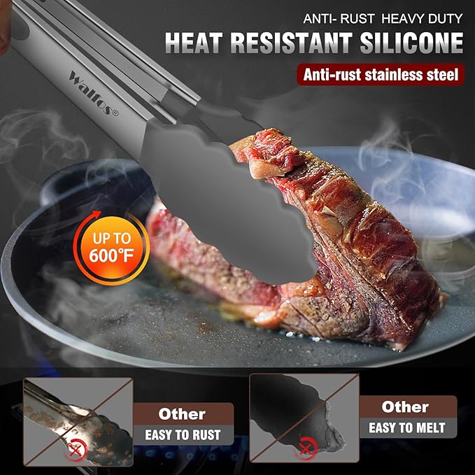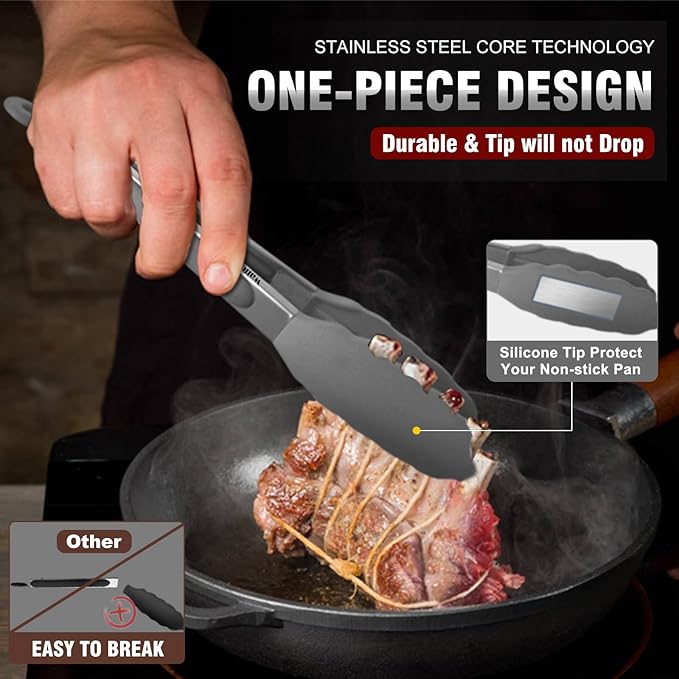 - ✓NON STICK SILICONE TIP, Tongs for Cooking won't MELT, RUST OR FLAKE-The tip is made of food-grade and BPA free silicone, which is safety-tested, heat resistant up to 600°F and will never rust. Kitchen tongs with non-stick silicone tips protect your cookware from damage, easy to clean and dishwasher safe.Great for Salad Cooking.