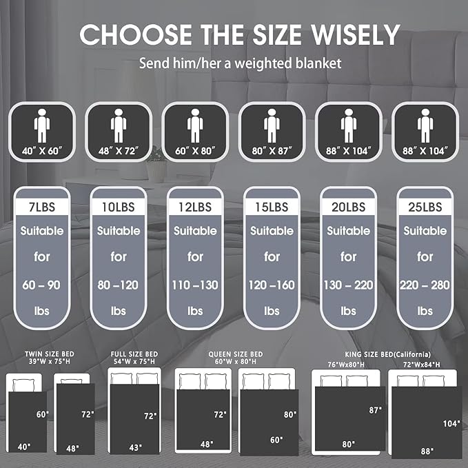 - SHOPPING GUIDE: Heavy blankets are available in 40"x60"throw size for kids,48" x72"twin size, 60"x80"queen size, 80"x87"king size, 104"x88"california king size, with 12lbs, 15lbs, 20lbs&25lbs weighted blankets respectively. You can choose freely according to your own needs, give you a variety of options.