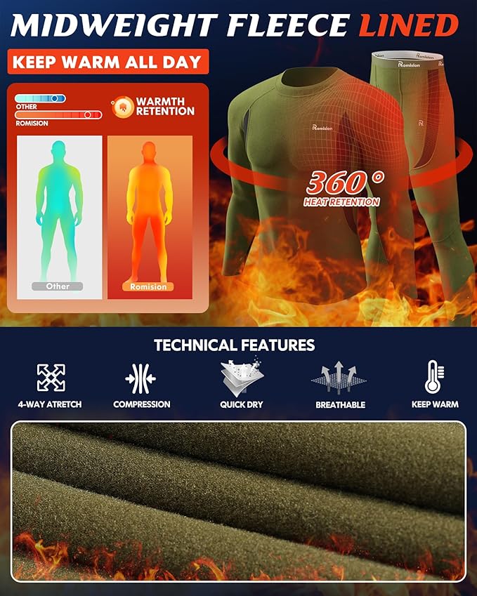 romision 2 Pack Thermal Underwear for Men Long Johns Fleece Lined Hunting Gear Bottom Top Set Base Layer Cold Weather XS-4XL