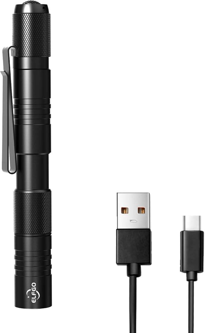 - WHAT YOU GET: 1 zoomable usb c pocket flashlight, 1 USB Charge cable; ELFGO genuinely LED rechargeable pen torch comes with a rotatable pocket clip, it can be easily carried in the pocket, slipped in your purse, or toolbar