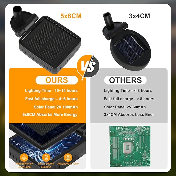 - 【Waterproof, Lighting Up More Time 8 LEDs Solar Ourdoor Lights】 With an IP65 waterproof rating, the solar lights outdoor decro are specially designed to withstand bad weather conditions, no more worry about rain, snow, frost, or sleet. The 600mAh high-capacity rechargeable battery lasts longer than other LED solar patio lights. The outdoor solar lights can light up for 10-12 hours during all night after a 6-8 hours solar charged in day even if it is a cloudy or rainy day.
