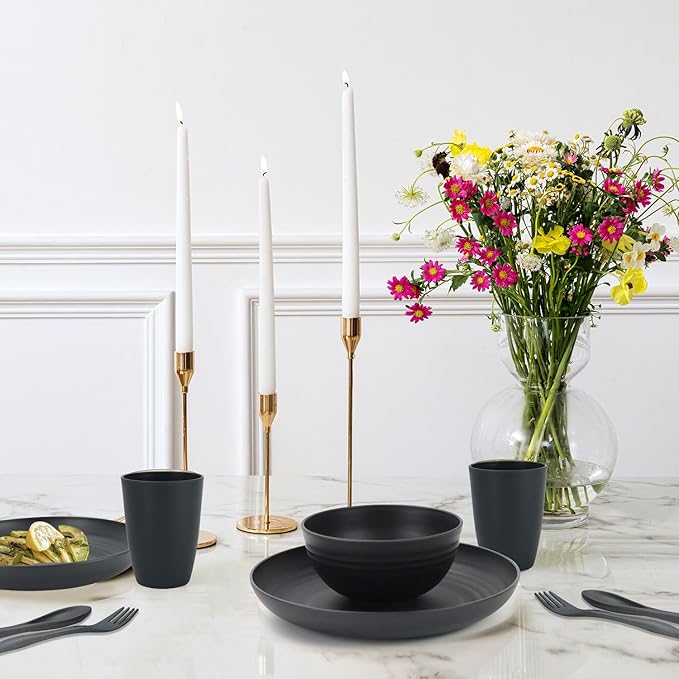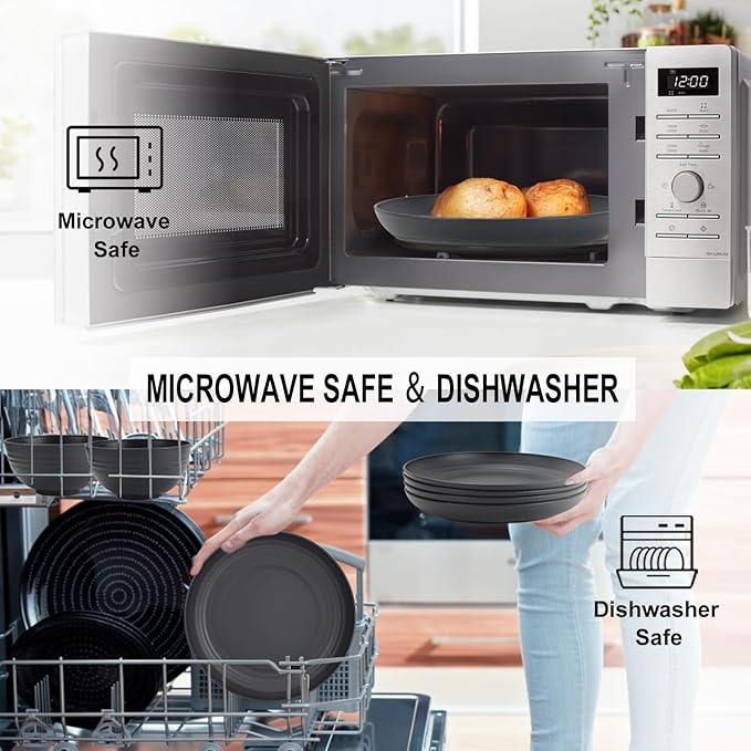 Wheat Straw Dishes Set for 4,Microwave Safe Plates and Bowls Sets, Unbreakable and Ruseable Plastic Dinnerware Sets for Kitchen,Camping,Dorm,Dessert Plates, Water Cups,Serving Bowls(Black,20 PCS)