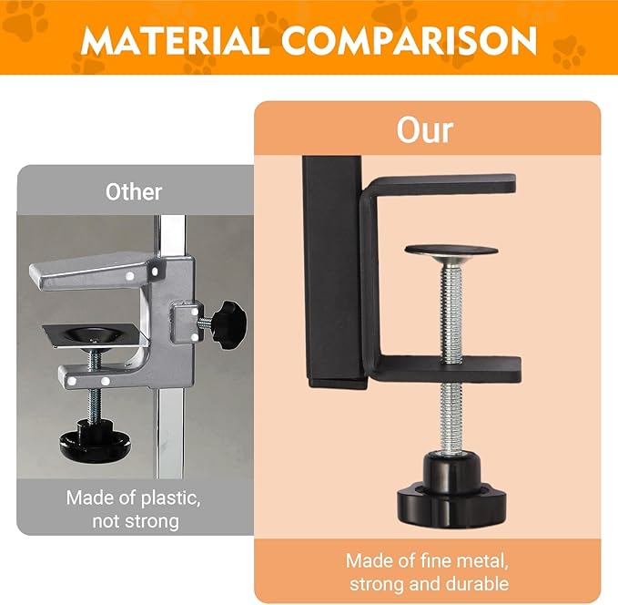 - [Durable Material] Our dog grooming table arm is made of heavy duty metal with rustproof coating. It can stand up to long-term use.This grooming arm features sturdy clamps to securely hold it in place while you groom your furry friend.