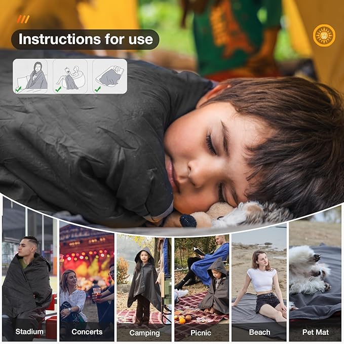 - ✅ STADIUM BLANKETS FOR KIDS WITH UNIQUE HOODED DESIGN - This small camping blanket features an adjustable waterproof hood with a cozy fleece liner. It is thoughtfully designed with a hook&loop fastener, allowing you to wear it on your body and keep your hands free. The clever design enables the portable camping blanket easily transform into a poncho in rainy days.