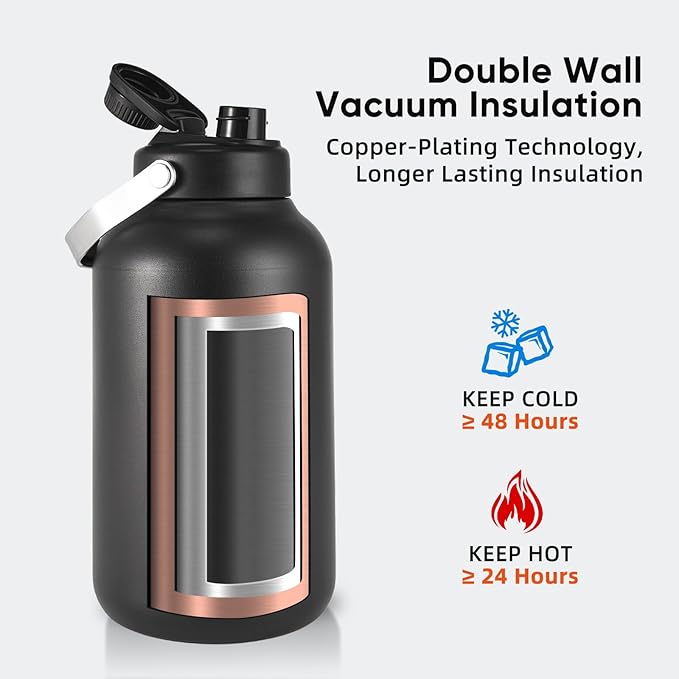 - DOUBLE WALL VACUUM INSULATION - The exterior of the vacuum-sealed area is dipped in copper which helps reduce the transfer of temperature and adds more insulation to your gallon water bottle. Maintain heat for 24 hours and cold for 48 hours.
