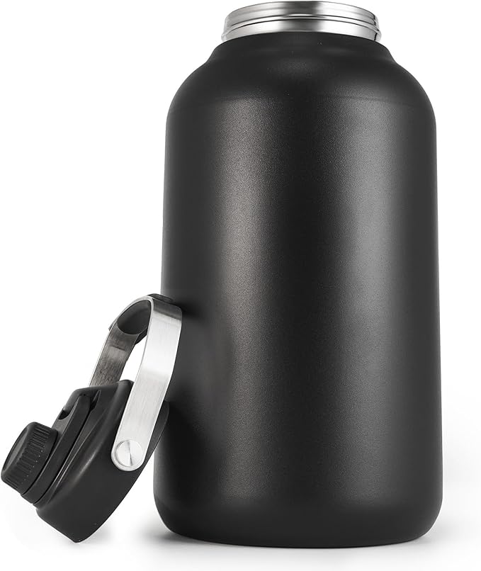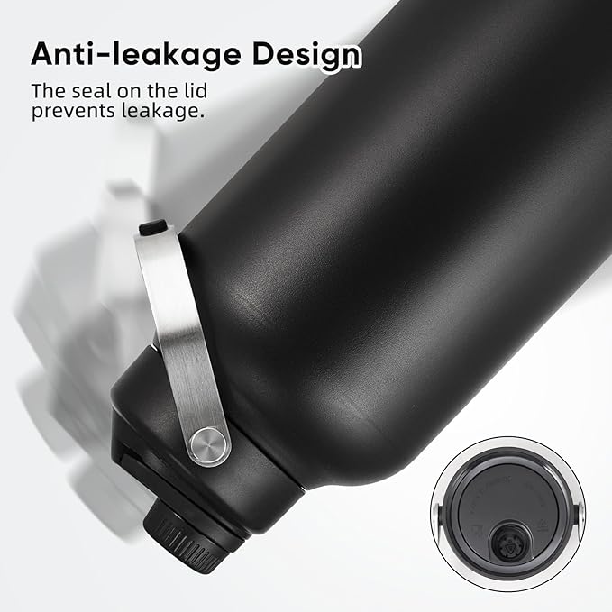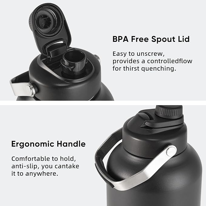 - LEAK PROOF & ERGONOMIC HANDLE DESIGN - Rubber ring inside the lid seals tight on the bottle without leakage & heat dissipation. Keep your drinks fresh and spill-resistant on the go. The 1.2 inch big spout allows you to chug directly or pour out fast for sharing. The stainless steel handle features a silicone holding pad in the middle, make this 1 gallon water bottle have a comfortable grip and carrying.
