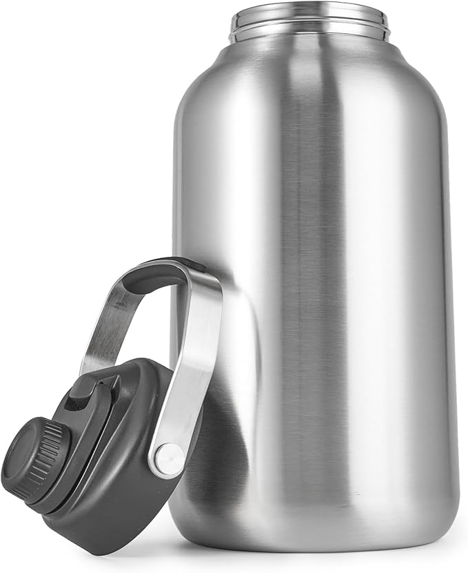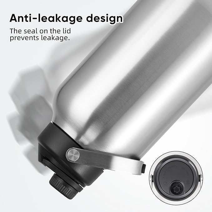- LEAK PROOF & ERGONOMIC HANDLE DESIGN - Rubber ring inside the lid seals tight on the bottle without leakage & heat dissipation. Keep your drinks fresh and spill-resistant on the go. The 1.2 inch big spout allows you to chug directly or pour out fast for sharing. The stainless steel handle features a silicone holding pad in the middle, make this 1 gallon water bottle have a comfortable grip and carrying.