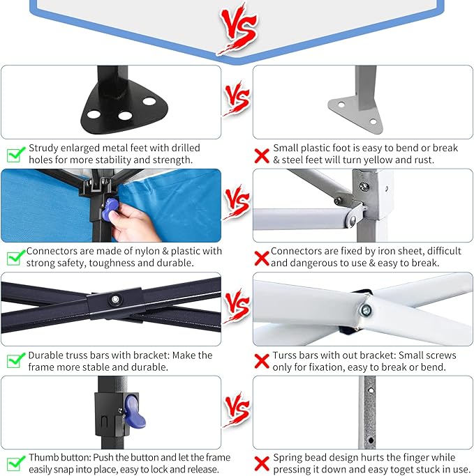 - STURDY STEEL FRAME AND TARPAULIN - Special thicken steel frame with anti-rust coating, it can prevent rust. The 10x10 ft pop up canopy tarpaulin is made of high density oxford cloth, the side of the 10x10 canopy tent is also made of oxford cloth. With the help of silver-plated PU lining, waterproof, UPF 50+, it can block 99% of harmful rays of sunlight.