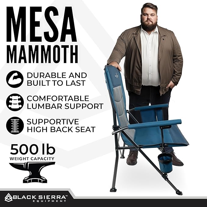 - LASTING SUPPORT: Heavy-duty powder-coated steel frame supports up to 500 lbs. This large folding chair measures 42.5”H x 27.5”L x 28.25”D when open, offering reliable support for every outdoor adventure.