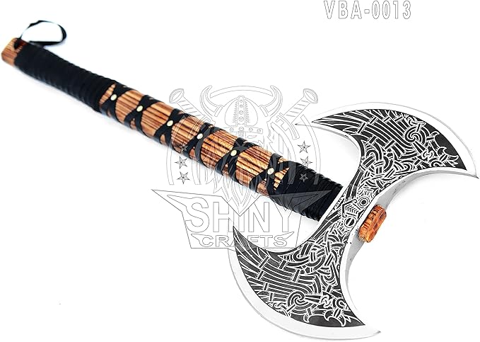 SHINY CRAFTS- Camping Axe Tomahawk Viking Bearded Axe Christmas gifts-27 Long Odin's Double Edge Head Viking Axe Twin Blade Axe with Ash Wood Handle with Genuine Leather Sheath (VBA-0013)