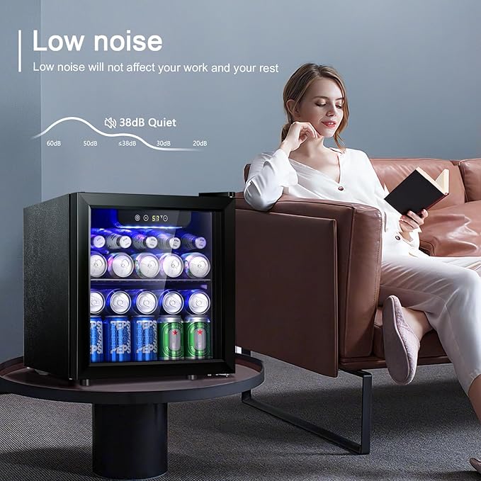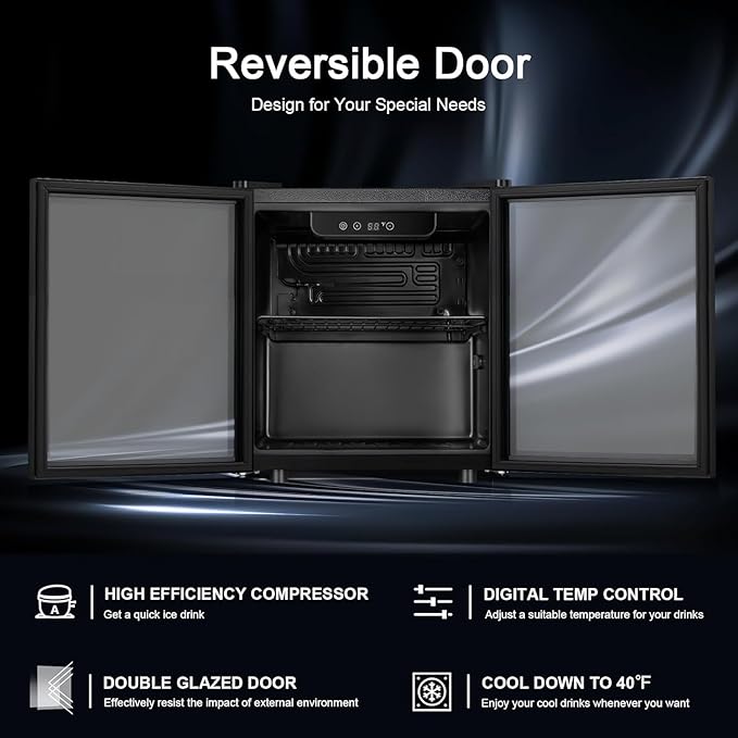 - IDEAL BEVERAGE COOLER: 16.46"D x 16.93"W x 18.5"H mini refrigerator can keep a variety of canned drinks or wine chilled without taking up too much space at your home, dorm, bar or office. It can conveniently hold 48 standard-sized drink cans or 12 standard-sized drink bottles. The interchangeable design of the left and right doors facilitates the selection of storage locations, adapts to the high-quality needs of different people and different locations.