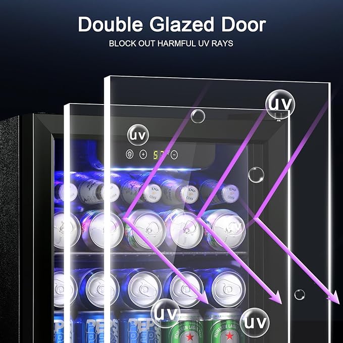 - IDEAL LIGHT and HUMIDITY: With its reinforced glass door with air tight seal and help to maintain an ideal humidity level, this beverage refrigerator gives you a compact and modern design perfect for your living room. Blue soft LED interior lighting not only beautifully showcases the wine but won’t damage the wine.