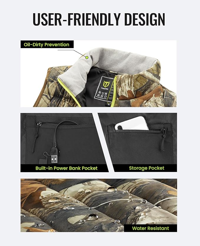 - 【Keep Your Body Warm and Cozy】4 heating zones are distributed across the collar, mid-back, as well as underneath the two pockets for core-body warmth. You can stay warm in all outdoor activities like hunting, ice fishing, ice hockey, and even outdoor work.