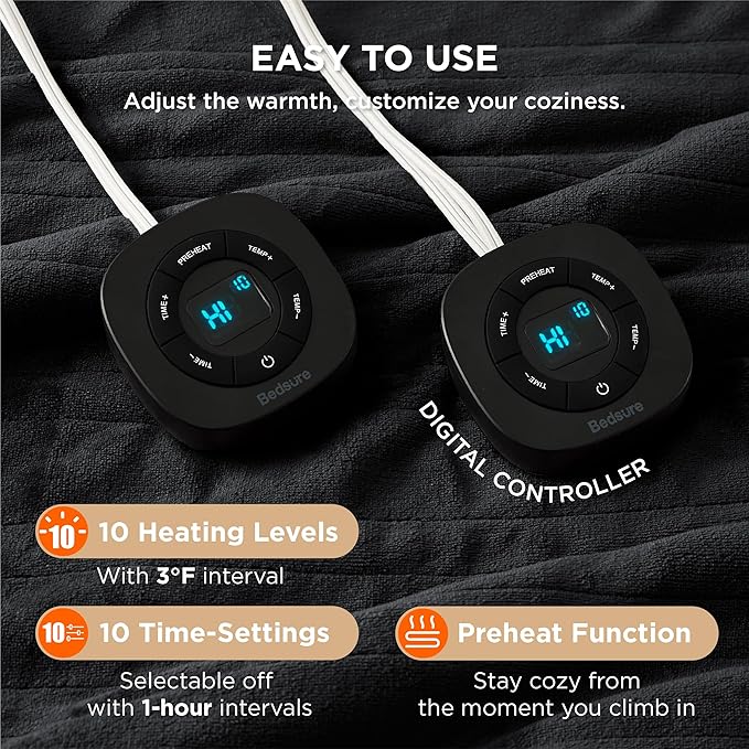 - Customizable Warmth: Featuring fast and consistent heating, this heated blanket queen size offers 10 heating levels and 10 time-settings for customizable coziness. Powered by advanced heating wire technology, it can precisely control temperature, ensuring safer warmth