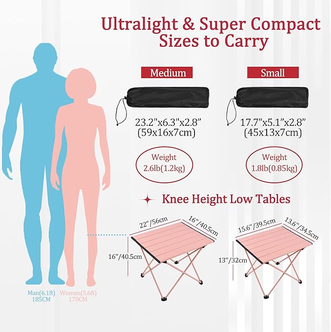 - Ultra lightweight and easy to carry - Our folding camping table has an aluminum tabletop and frame, so it is lighter than another wooden camping table of the same size, with a weight (Small: 1.85 pounds / Medium: 2.6 pounds / Large: 3.3 pounds) that is lightweight enough to carry. It can be folded into the accompanying handbag, placed in a backpack, or placed anywhere needed. The small camping table provides a stable working platform for amateur enthusiasts. This portable camping table is the perfect companion for portable camping chairs or folding stools. You can even use it as a folding beach table, or a tent table sitting on a beach mat or camping mat.