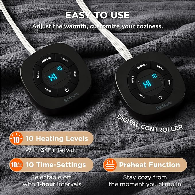 - Customizable Warmth: Featuring fast and consistent heating, this heated blanket queen size offers 10 heating levels and 10 time-settings for customizable coziness. Powered by advanced heating wire technology, it can precisely control temperature, ensuring safer warmth